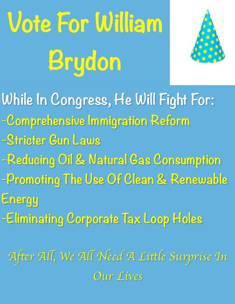 Contrary to popular belief and speculation, the candidate from the Surprise Party, William Brydon, has an in depth plan for immigration reform. This idea stemmed from a secondary question that twisted around his words. Many people now believe that Mr. Brydon plans to do something akin to opening up borders, or making illegal immigration easier. That is false slander from an opposing candidate just trying to take a stab at Mr. Brydon.